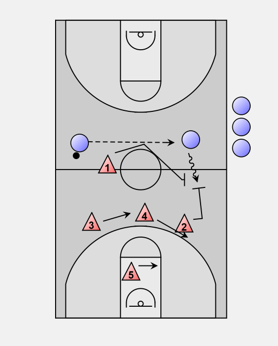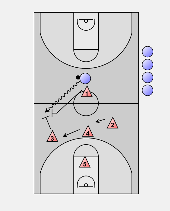 A wing player can fake a trap (hedge and recover). If the ball handler stops and picks up her dribble before mid court, the wing player yells "Dead", point defender X1 smothers her check, and X3, X4 and X2 face guard and deny a pass to other attackers, including any reversal pass.