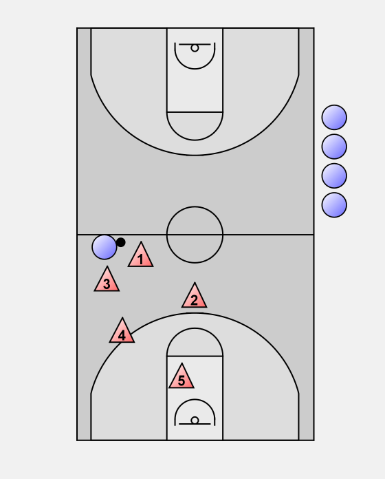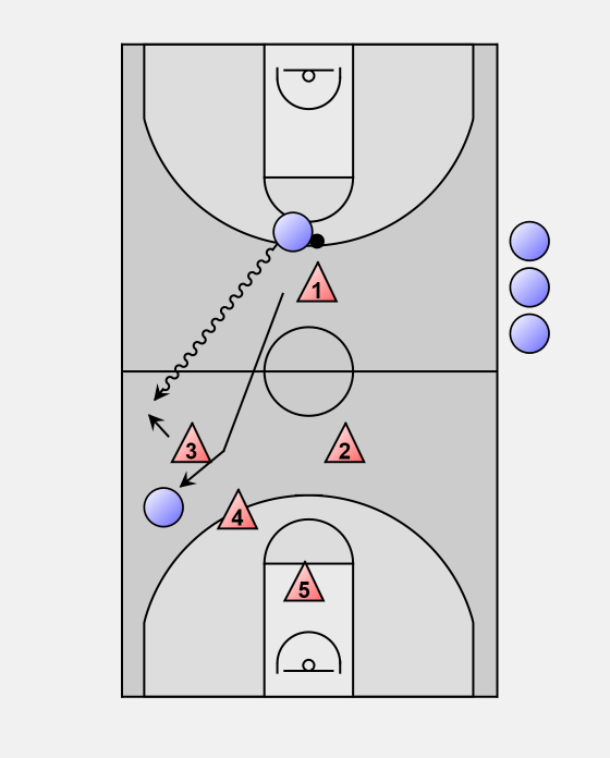 Point defender X1 picks up and pressures the ball handler before centre, forces the dribble to either sideline, and traps with the ball side wing defender once the ball crosses centre. Left wing X3 initially denies the pass into the corner, and does not move up until the ball has crossed centre.