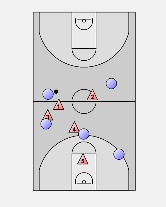 Center X4 stays on the vertical line of the ball as it is brought up the court.