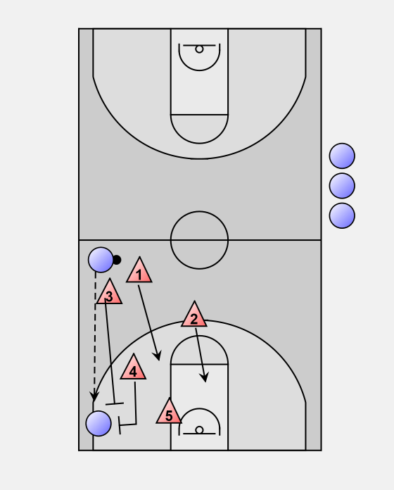 If safety X5 moves out to defend/trap the ball handler in the corner, centre X4 would take her place at the ball side low post.