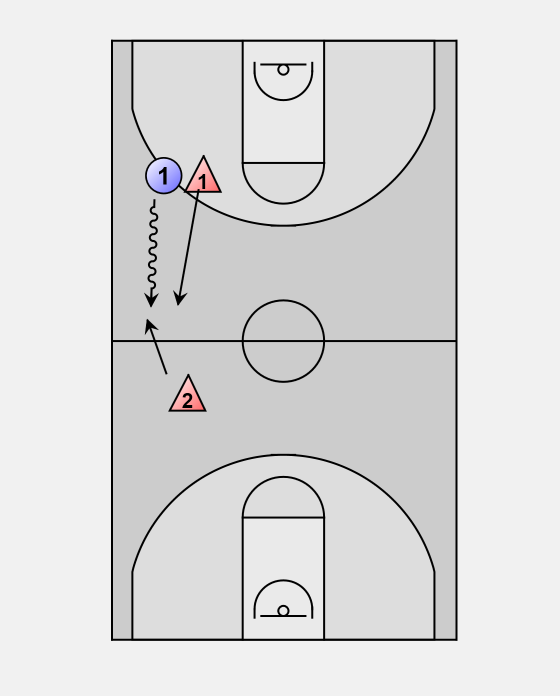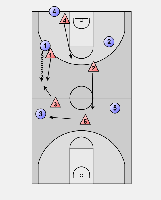 x1 will get right up on 1 to force him to dribble. If x1 gets beat up the sideline then x3 will come up to trap, only if x1 is on the side of 1, not trailing. If x1 is trailing, then x3 will "stunt" or fake at 1 but not commit until x1 recovers to the side of 1. Everyone rotates on the trap.