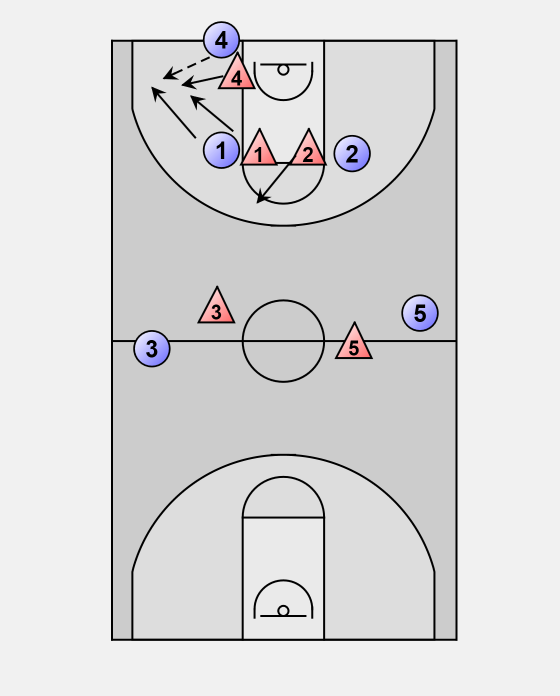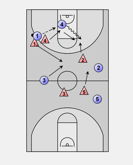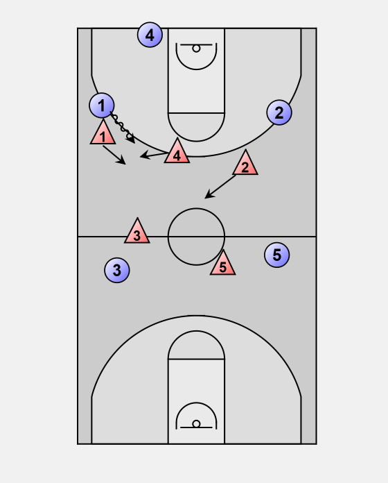 If x1 gets beat to the middle of the floor, then x4 will trap the ball.