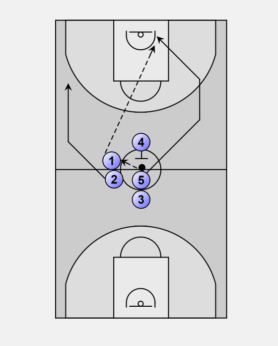 5 taps the ball to 1, and 2 breaks towards the wing.