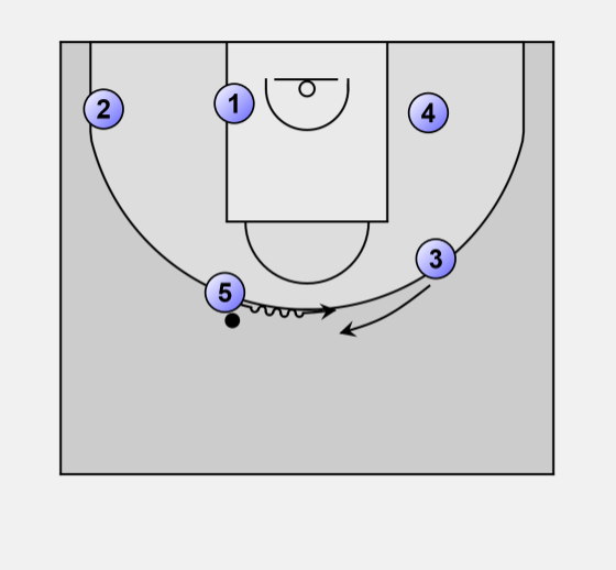 5 goes to the low post and receives the ball from 2.