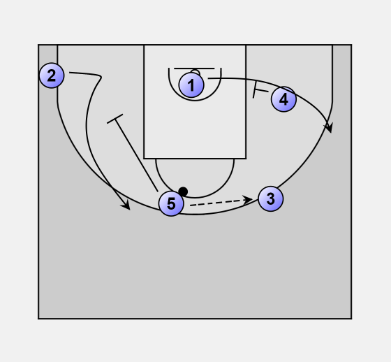 5 passes to 3 (pass) and sets a screen on 2 (screen away).