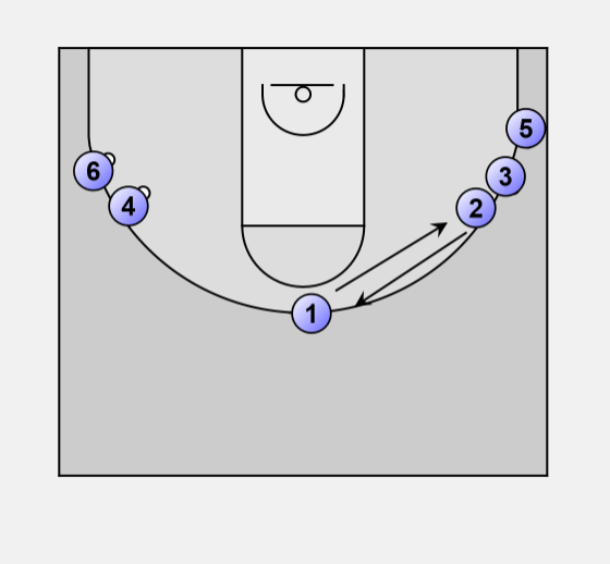 Player (1) back cuts, receives the pass from Player (2) and makes a layup.