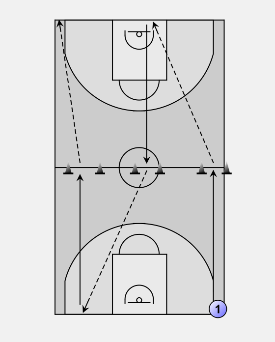 Players sprint to the first set of markers @ the half way line. Once they reach the markers they touch and pivot 180* in one movement and back pedal on their toes as quickly as possible until they are directly under the opposite basket.