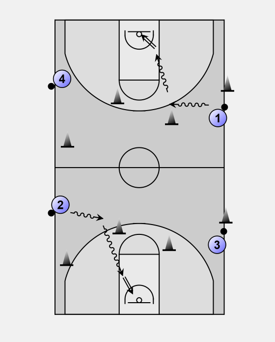 After player 1 and 2 have 'backuped' again they make a short sideway driblle and go hard to the basket to make there lay-up.