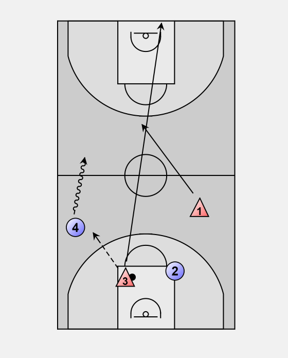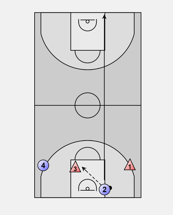 This becomes a 2-on-2 drill IF the defense (# 3) has hustled down and #2 has contained the ball properly. If not, it becomes a 2-on-1 until #3 can recover.