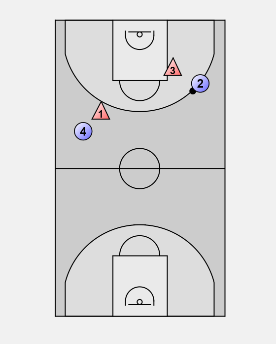 Player 2 passes to #3 at about the free throw line elbow.