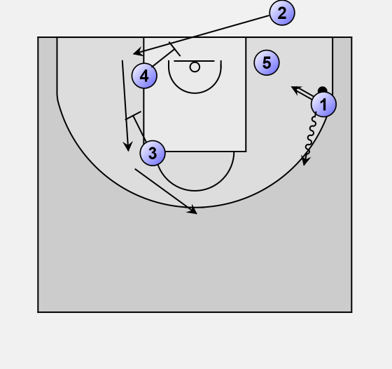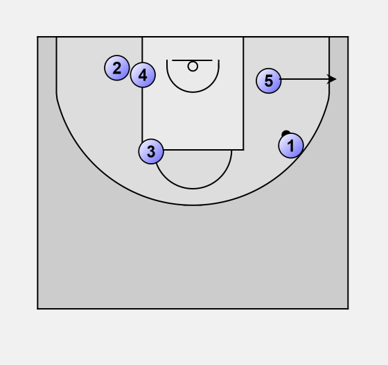 Guard 1 goes set a screen for 5 and #1 pops-out and receive the ball from guard #2, 5 sets a screen for guard #1.