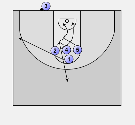 As 1 cuts, 4 and 5 screen down on 2's man.