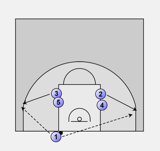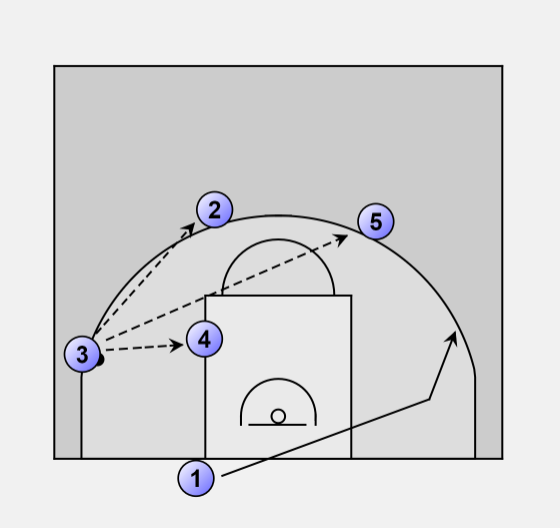 If 3 receives the pass, 5 now screens the middle defender in the zone, this allows 4 to come across the key to the ball.