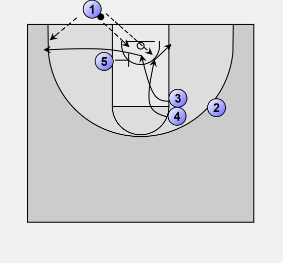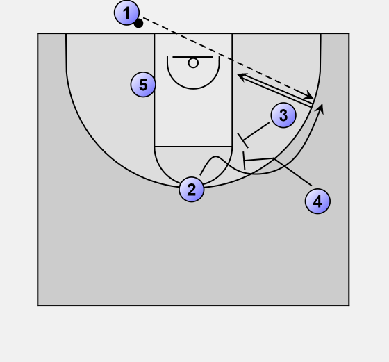 3 and 4 set a double screen for 2, note that 4 is behind/on the same line when the play starts. (Defense will be confused the first time).