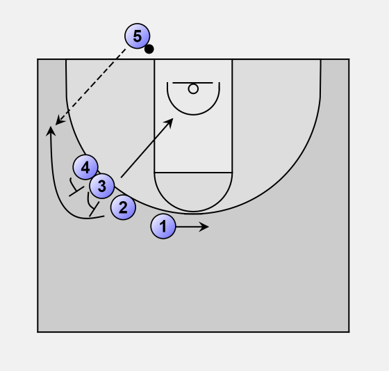 2 uses the staggered screen from 3 and 4 to get free in the corner.