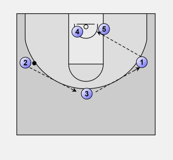 5 waits only a beat (for possible Post-Up pass from 2) before going to screen away for 4.