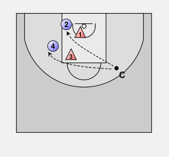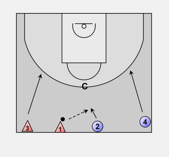 Both players who began on the ball side (1 and 3) are going to defend the other players.