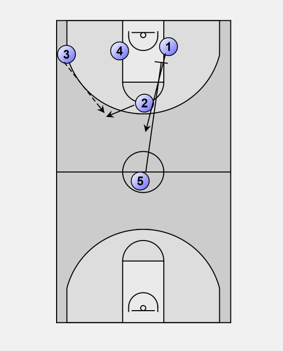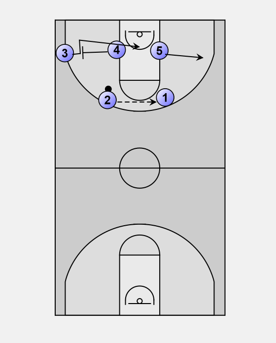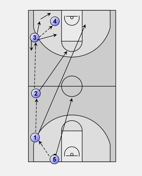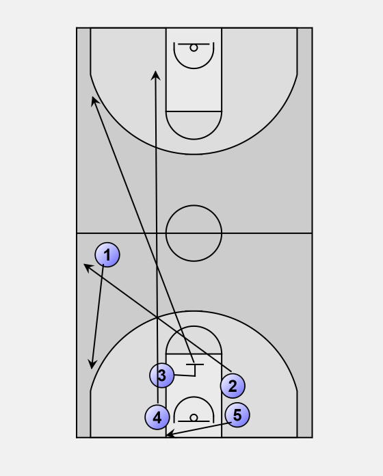 1 pass to 2. It is ok to skip pass to 3 if 2 is guarded or not in position. 1 sprints to the block opposite 4.
