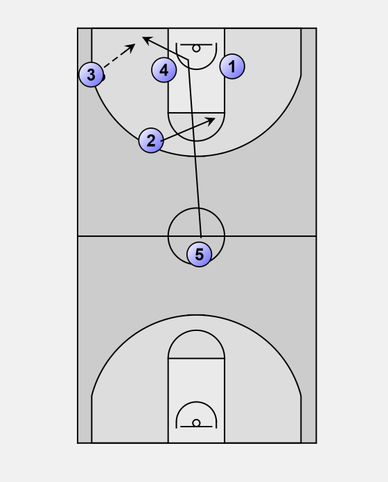 3 pass to 4. It is critical that 3 not pass to 4 until after 4 stops and posts. Most passes to 4 while he is still moving have resulted in turnovers for us instead of an easy basket.