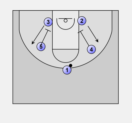 • Forwards screen down to the blocks, shooting guards cut to wings.