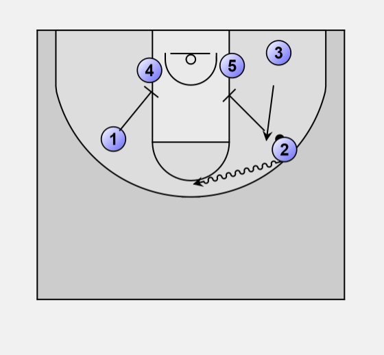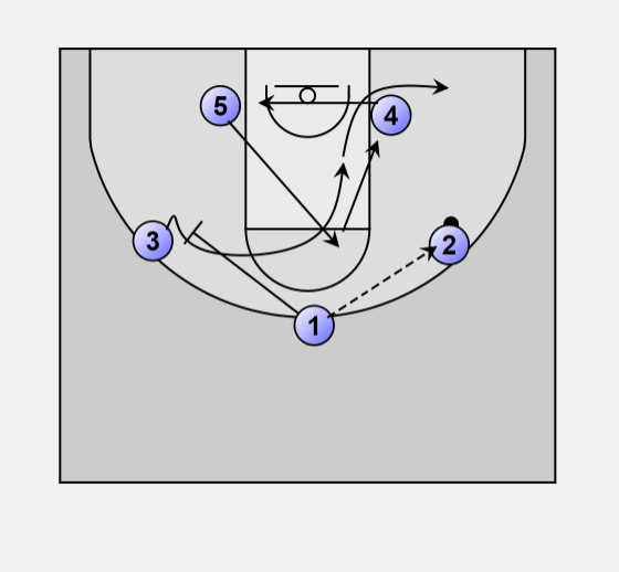 4) pass to 5 at elbow, 5 look for 4 and 3 under basket