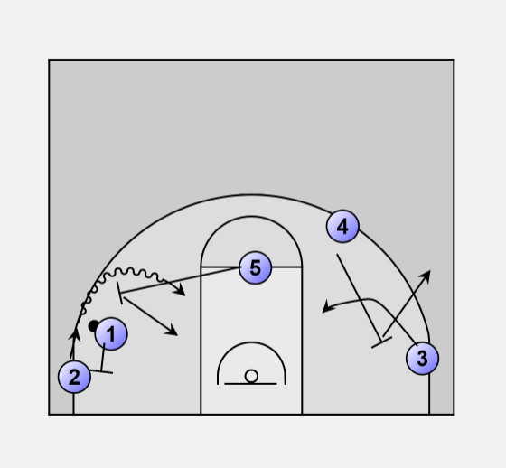 1 screens for 2 off the dribble hand off while 5 follows with a 2nd screen for 2.