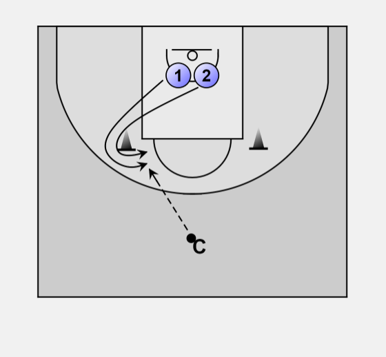 Player 1 and 2 stand side by side each other. Coach has a ball.
