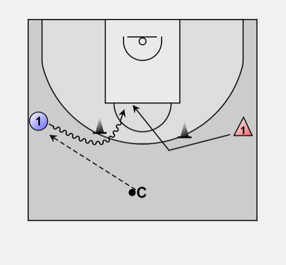 Player 1 must decide whether to drive for a layup or pull up and shoot a jump shot.