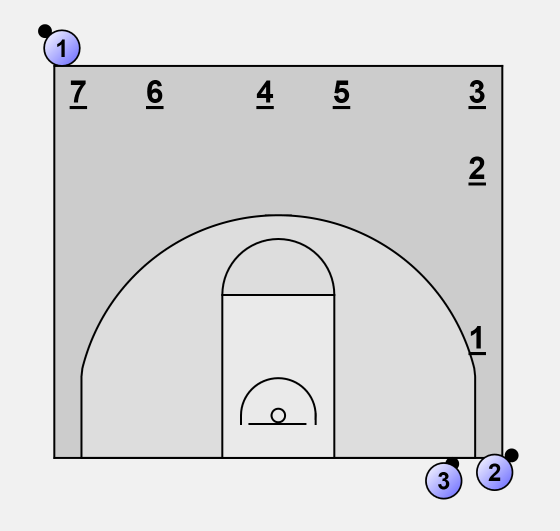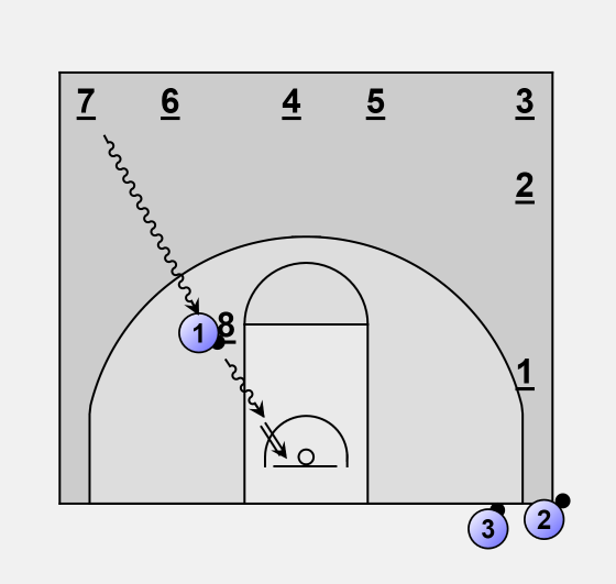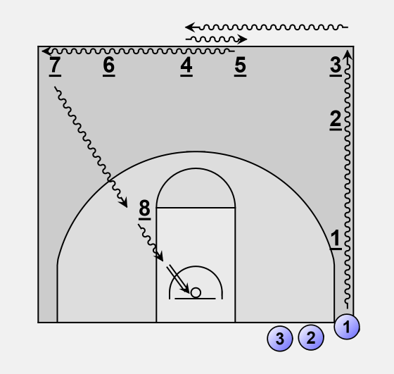 7. Player plants his right foot where the sideline and half court line intersect (7) and executes a behind-the-back dribble from his right hand to his left hand, trying to cover as much ground as possible by pushing off his right foot toward the next position.