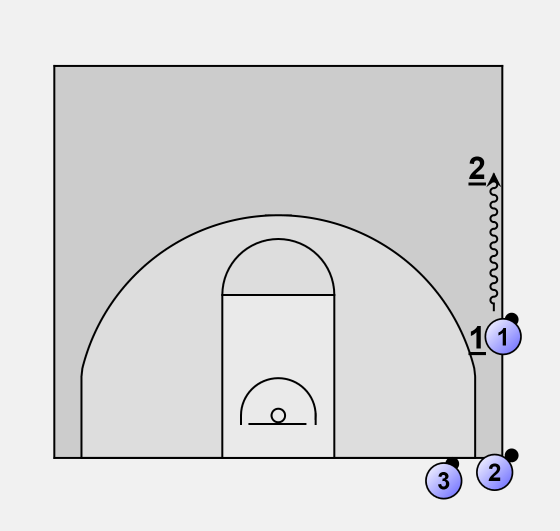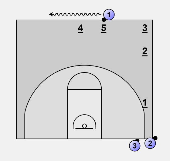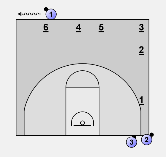 1. Player executes an inside-out move. To do this, he dribbles twice on the line directly in front of him. On the third dribble, he takes the ball across his body and bounces it to the left of the line in front of his left foot. Then he explodes past an imaginary defender by pushing off his left foot and pushing the ball in front of him back on the line, trying to cover as much ground as possible. Player must keep his knees bent and keep his body on the line, moving only the ball. He should end at position (1). Note that the ball remains in player's right hand during this step.