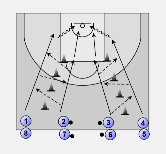 • When player 2 cuts below the free throw line, they become the defender and attempts to place pressure on the shot being taken by 1.