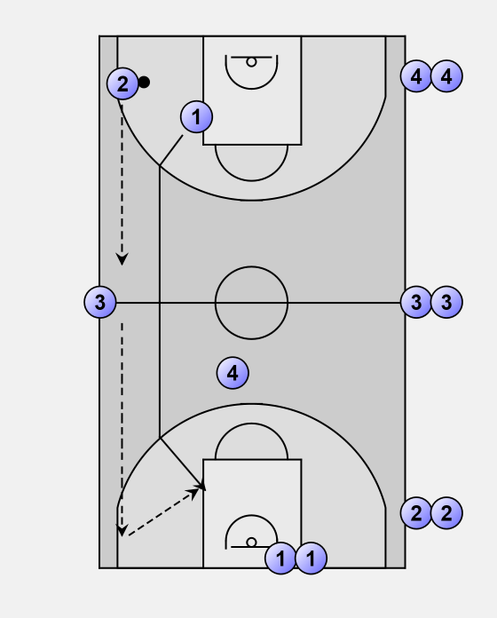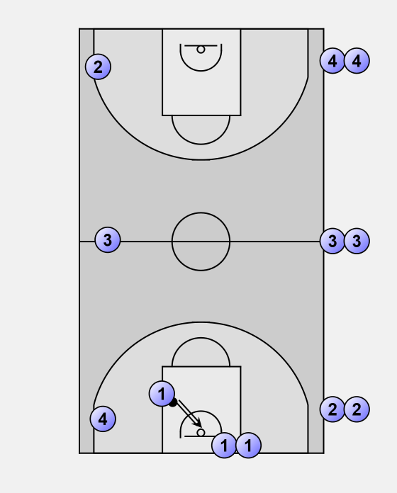 1 shoots and another player in row 1 grabs the rebound to go ahead with the drill.