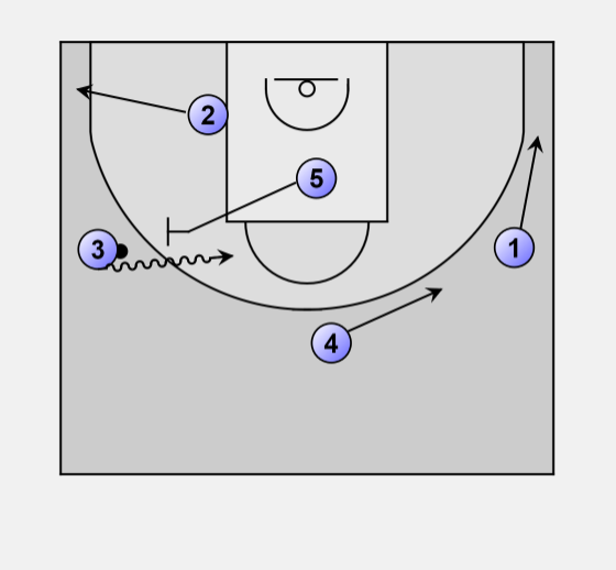 5 comes up and sets a screen for 3. Followed by a side pick & roll.