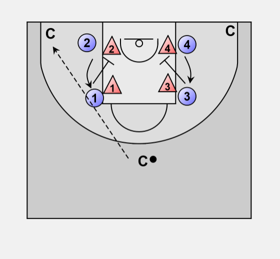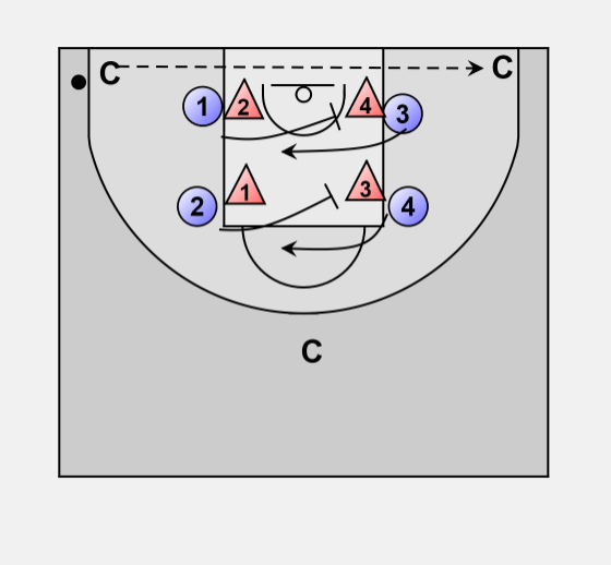 • Coach at the top says "go" the offensive players at the elbows screen down for the players on the blocks