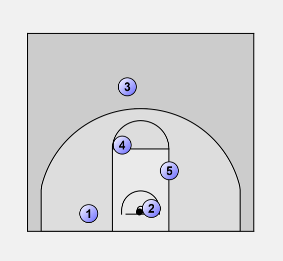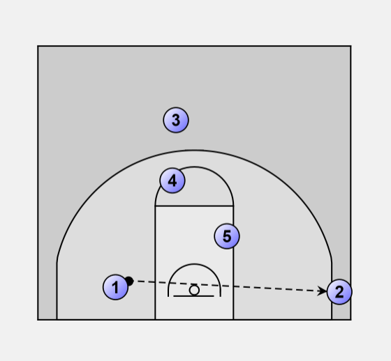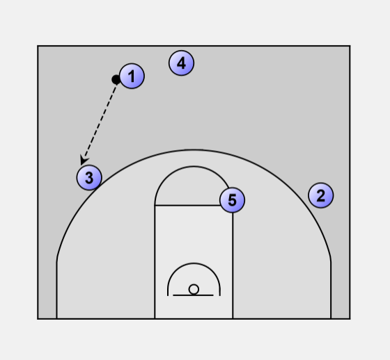 The SG is wide on the weak side, and the center is in the high post. The SF is on the strong side wing and the PG initiates the play by passing him the ball.