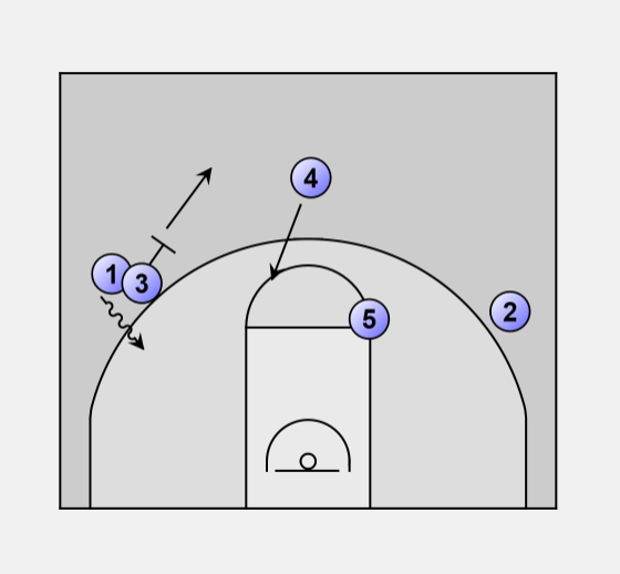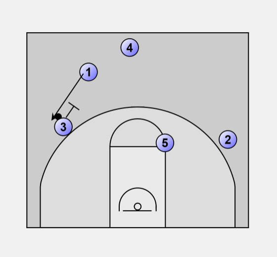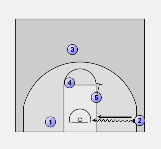 1 drives on the slower defender baseline, hopefully forcing 5's man to give help, and forcing 2's man to rotate over to help on 5.