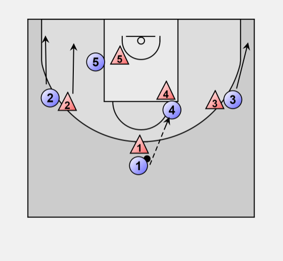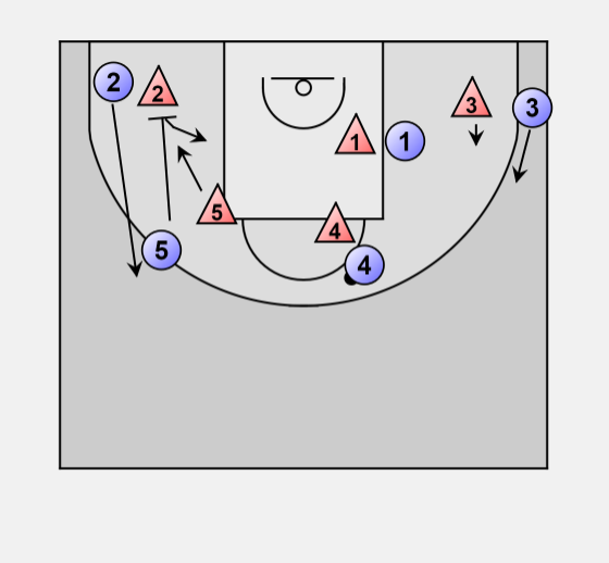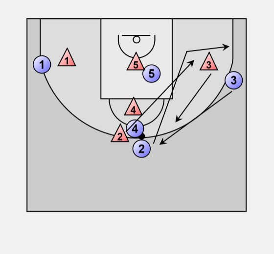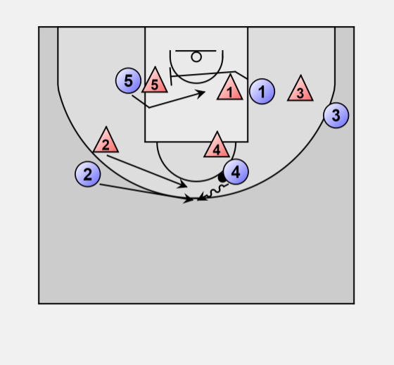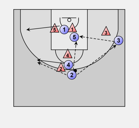 4 sets a dribble screen for 2, hand off between 4 and 2.
