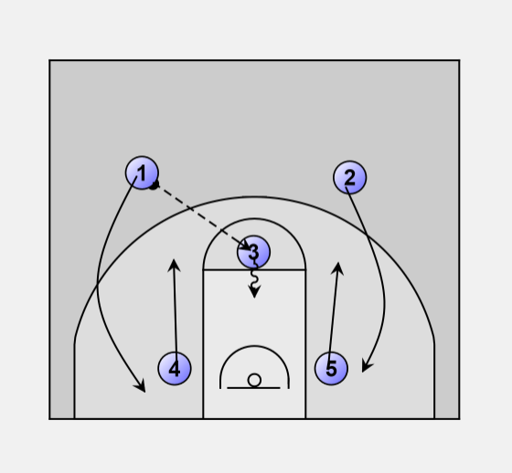 The guard then cuts on the outside towards the baseline and the other forward retracts away from the basket towards the ball handler.