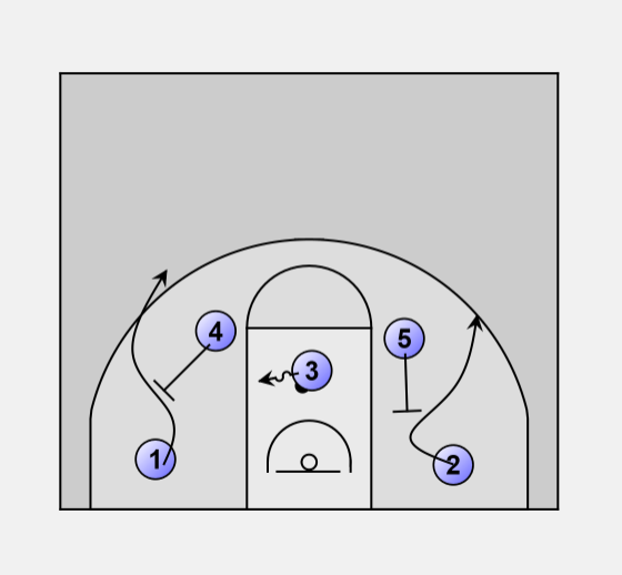 This confuses the defense as there are two screens set leaving two shooters open beyond the arc. It also makes the defense worry about the 4 and the 5 rolling in from their picks.