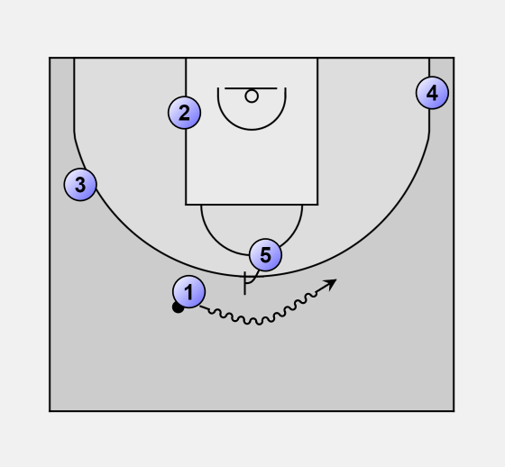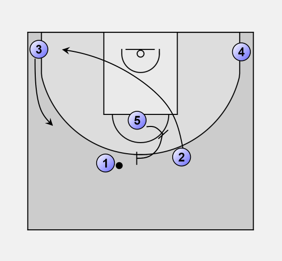 After the screen for 2, 5 sets a screen for 1. (Sometimes the defender of 5 goes helps with 2 direct pass from 1 to 5 possible)