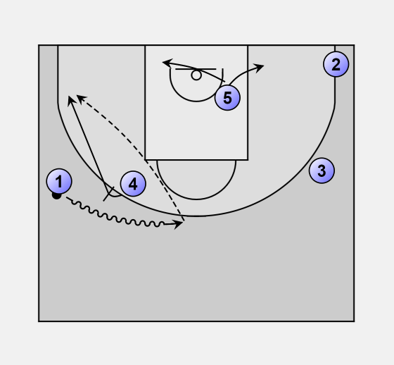Pass from 1 to 4. Direct shot or pass inside (5 posting up, or 2 cutting)