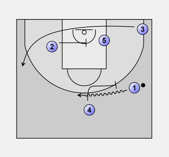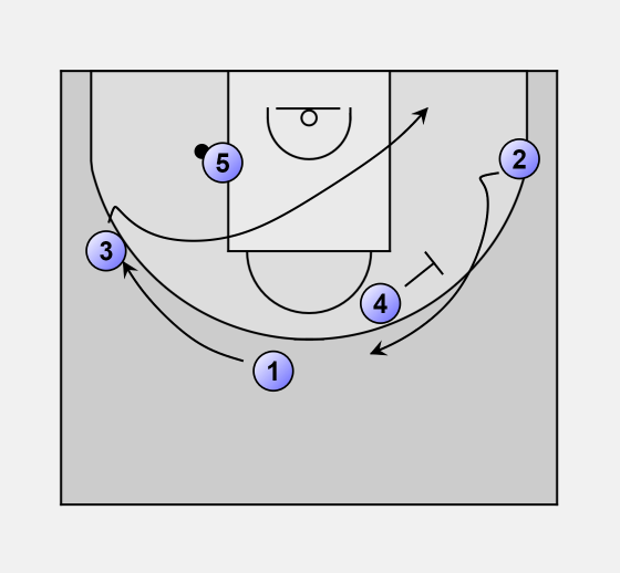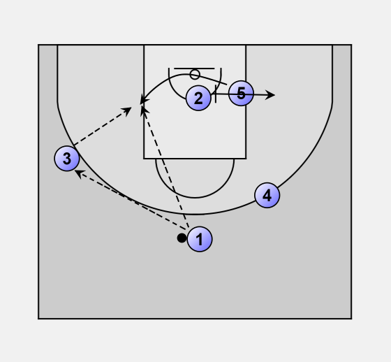 Depending on the defender (passing angle), direct pass from 1 to 5 or a pass from 3 to 5.