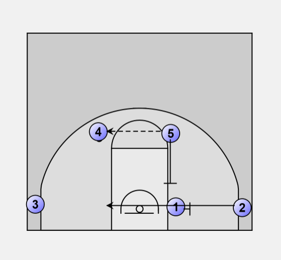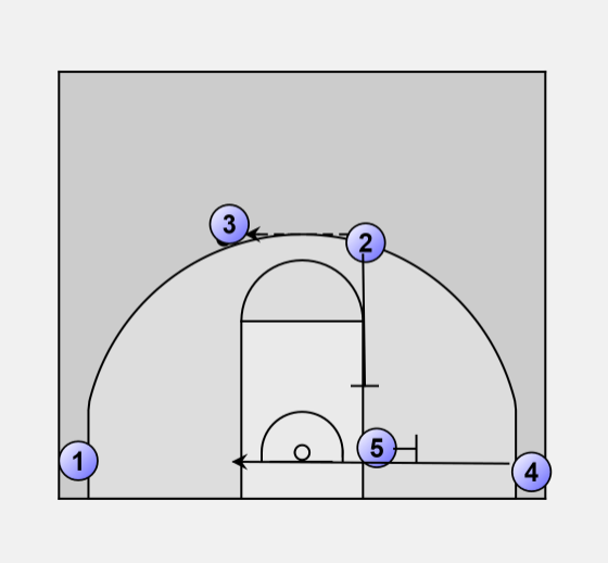#4 comes up lane off of #3's down screen to receive pass from #5.