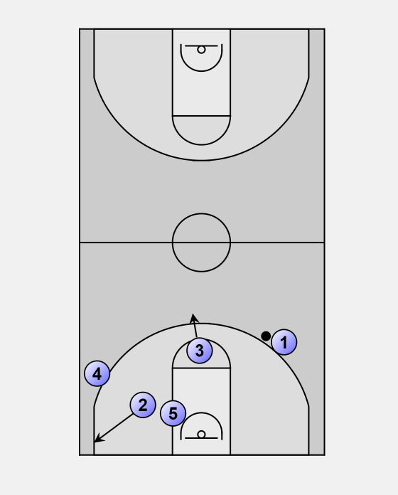 3 will follow the cut by 4 and cut hard from the help side to the basket. 3 will establish position at the rim looking for the entry pass and easy score.