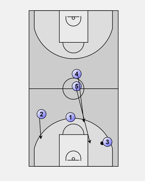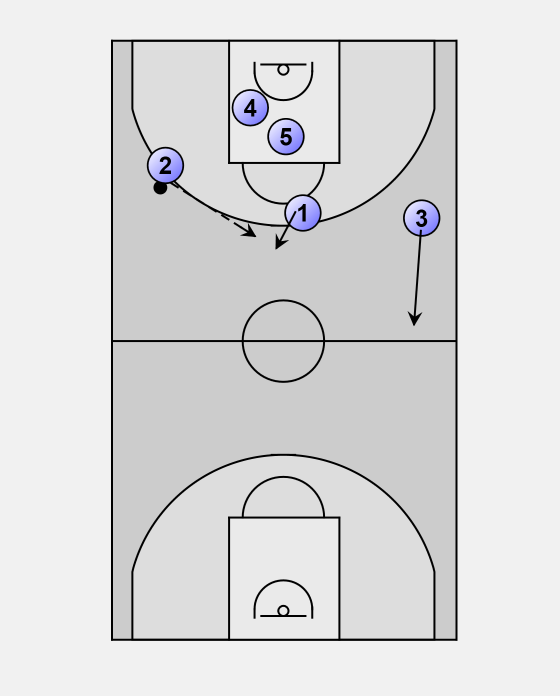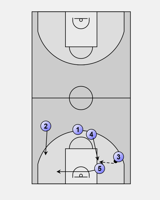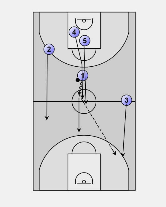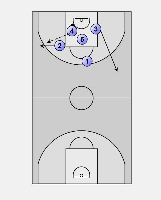 When player four rebounds ball, player two makes his move to be in good angle for pass from player 4. At the same moment player three, as an opposite wing, runs forward for a later pass.