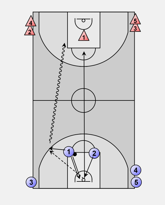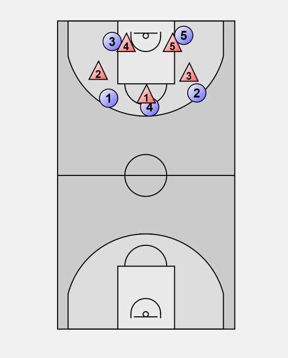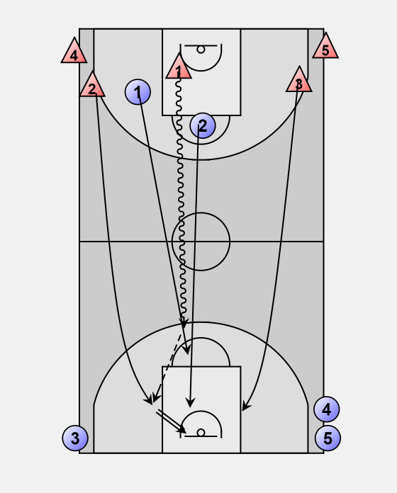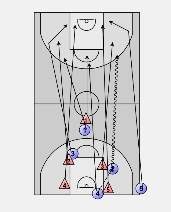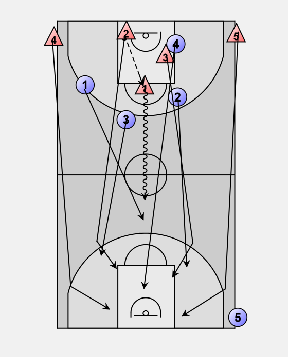 We transition back down court adding in R2 & R3 to make it 3 vs. 2 back.