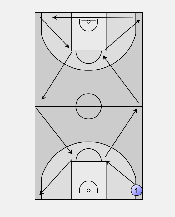 Then he sprints to the junction 1/2 court line and the sideline and makes a sharp cut to the left, pushing off the right pivot foot.