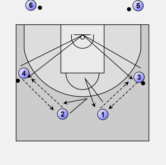Catch, Square-Up and Shot-Fake (CSUSF) from the previous sequence, 3 passes back to 1. The pass back to 1 is with the outside hand (one-hand push pass).