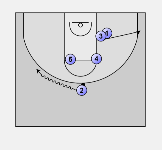 3) Pass to 3: If the defender of 3 leaves his man to help on the penetration, 1 can kick out to 3 for a three point shot from the corner.