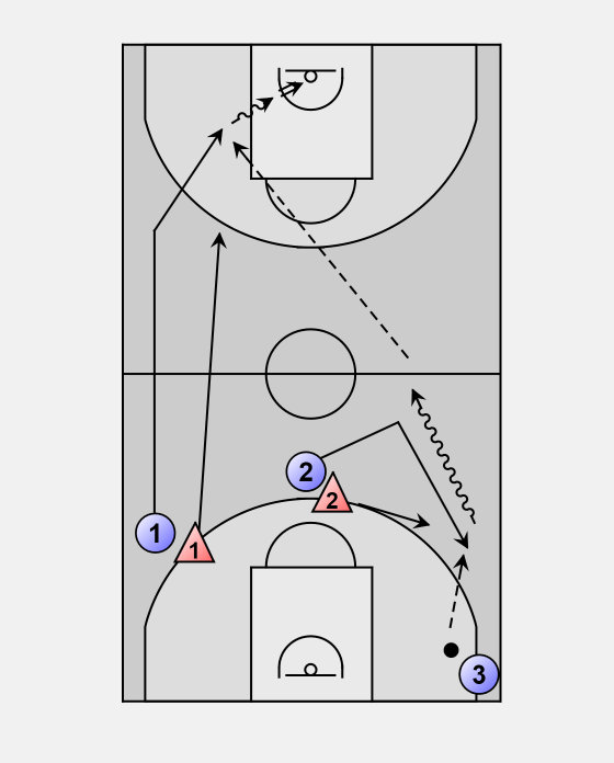 #1 sprints to the offensive board and receives a baseball-pass from #2